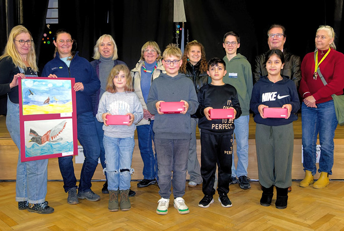 Die eingereichten Bilder wurden im Rahmen des Zugvogelfestes, das am 20. Oktober in Horumersiel stattfand, ausgestellt. Unter allen teilnehmenden Kindern wurden zehn Ferngläser verlost, die von der Firma Minox gestiftet wurden. Vier der Gewinne entfielen auf Kinder unserer Schule. Diese wurden am 15.11. durch Hannah Wilting von der Nationalparkverwaltung überreicht.